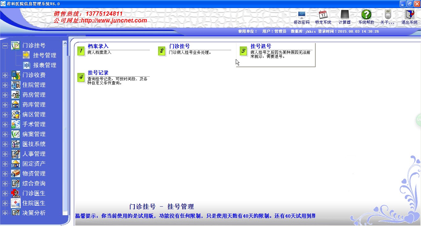 (適用于門(mén)診部、社區(qū)門(mén)診、門(mén)診醫(yī)院、門(mén)診藥房、中西醫(yī)結(jié)合門(mén)診,適合多臺(tái)電腦聯(lián)機(jī)工作的門(mén)診部,網(wǎng)絡(luò)版SQLSERVER2008/2005/2000數(shù)據(jù)庫(kù),最新版請(qǐng)聯(lián)系官方,醫(yī)保接口追溯碼接口可以聯(lián)系君科有償對(duì)接) |